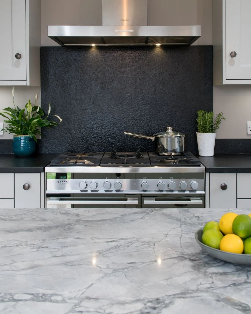 We supplied and installed the stone worktops across the kitchen, helping choose materials that would work visually and practically together.